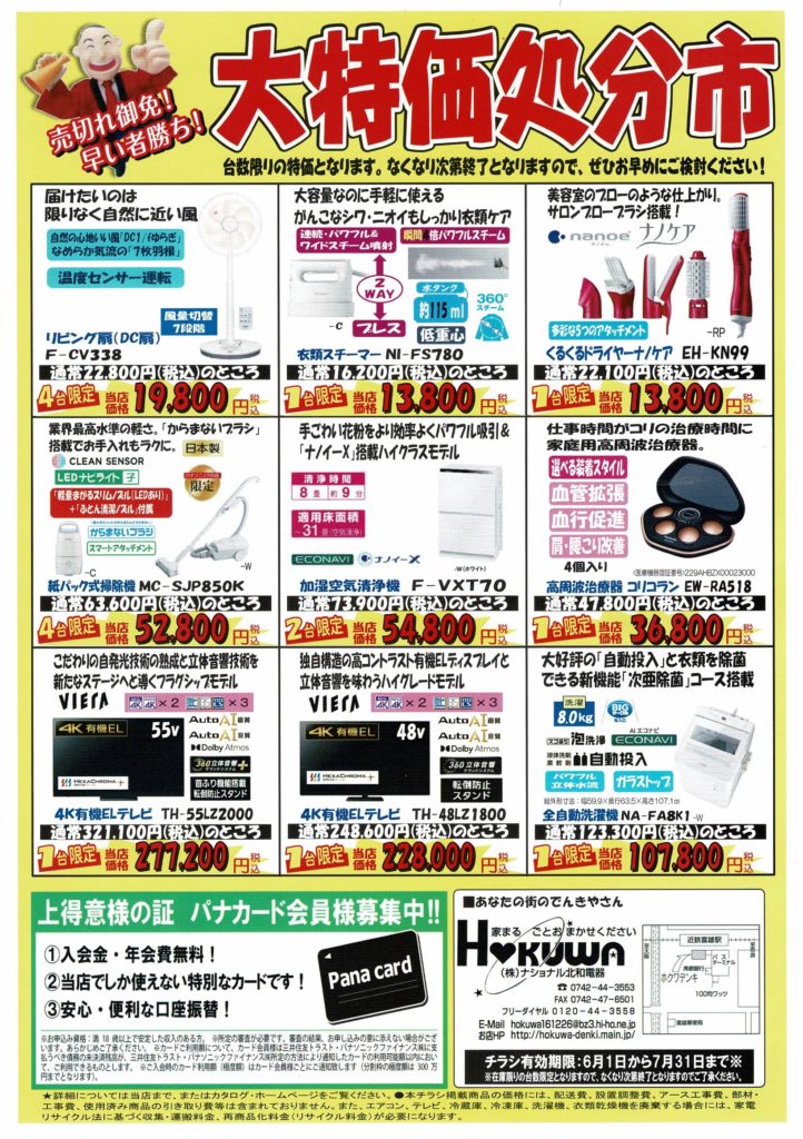 「大特価処分市」「2日間だけのお買い得商品」も多数ご用意しておりますので、皆様のご来店をスタッフ一同お待ちしております。又お電話・FAX・メールでのご注文やお問い合わせもお待ちしております!