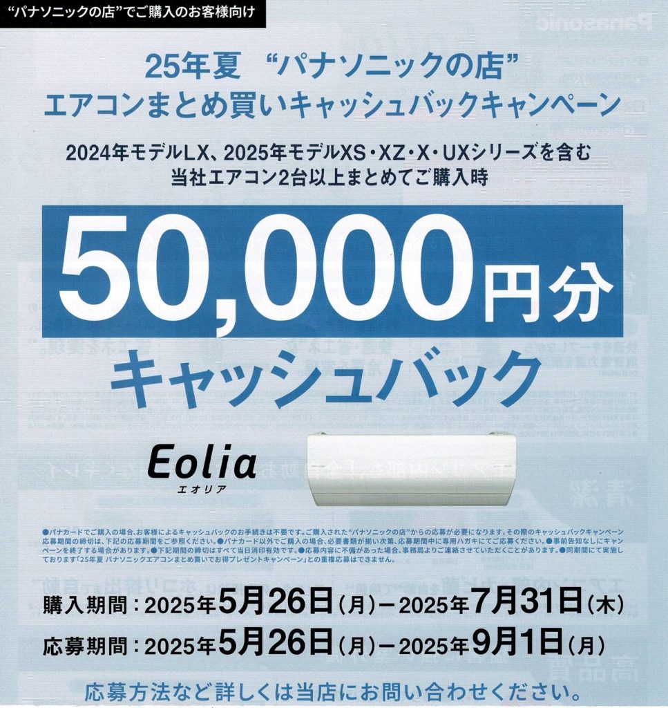 今回の夏の個展にあわせてエアコンやテレビのキャッシュバックが多くあります。当店にお問い合わせください。 また2025年省エネリフォームキャンペーンもお問い合わせください。