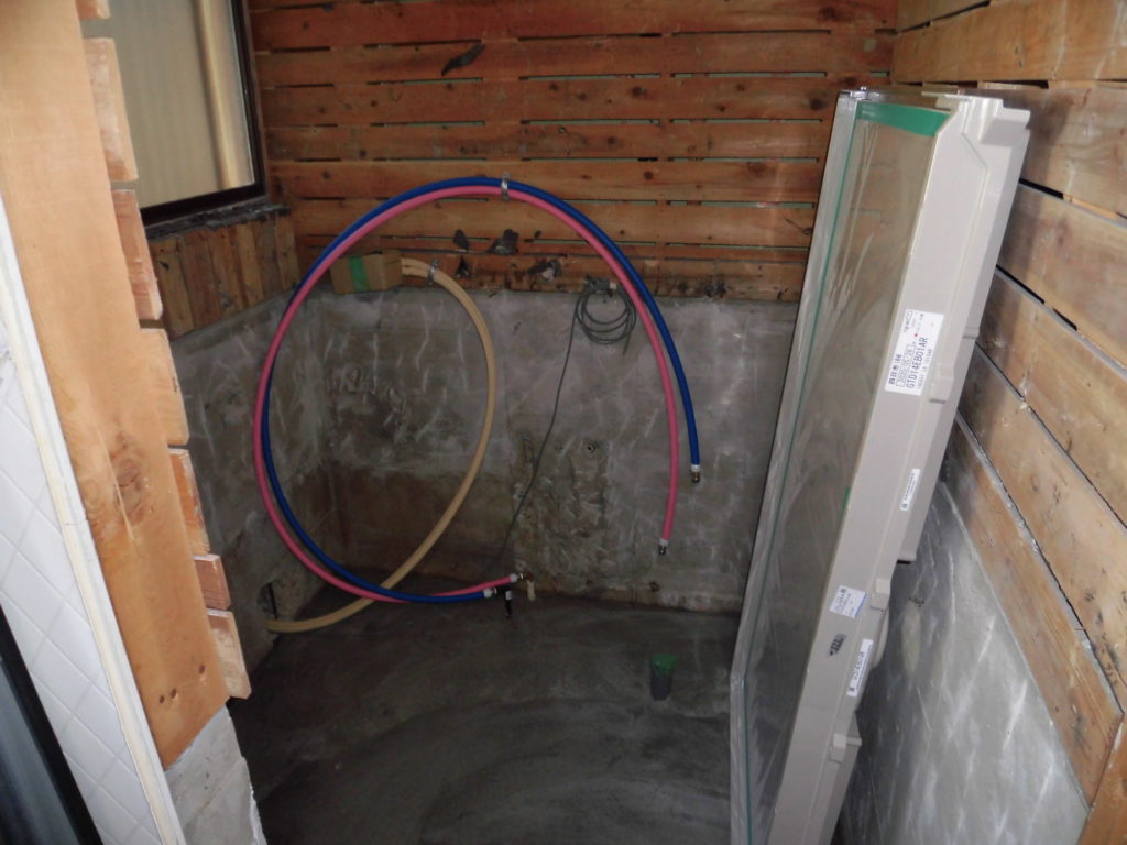 土間にコンクリートを打って、給水浴槽配管をしています。