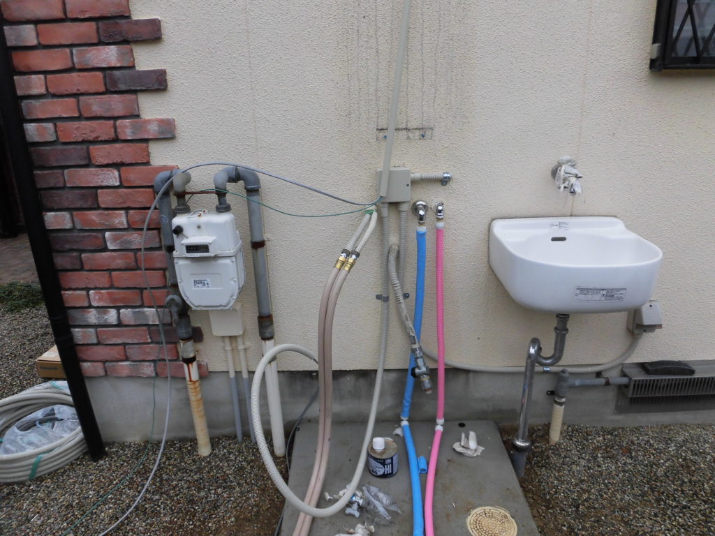 ガス給湯器を取り外し電気工事・給湯・水そしてお湯の配管を延長しています。