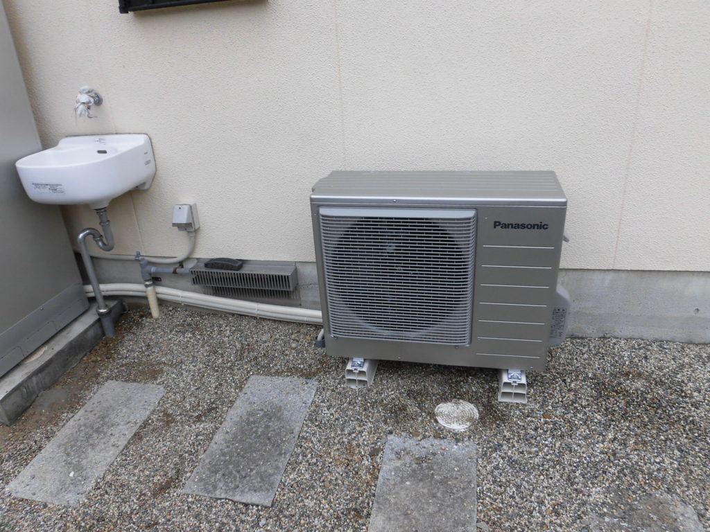 本体とヒートポンプユニットを設置しました。エアコンの室外機のような商品ですが空気中の熱を取り込み熱交換することでお湯をつくる手助けしてくれてます。