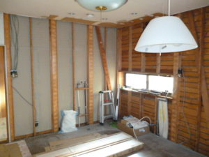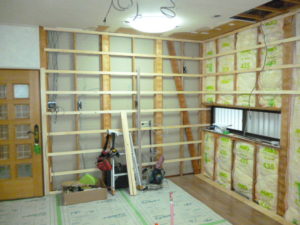 壁の内部にはL断熱材を入れていきます。これで台所はポカポカです!