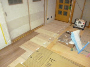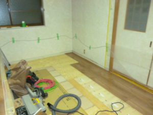 床のフローリング張り替えをして、床暖房のパネル工事の様子です。