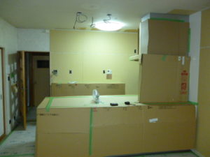 キッチン・カウンターを取り付け完了です。クロス張り替えなど、まだまだ工事がありますので養生をしています。