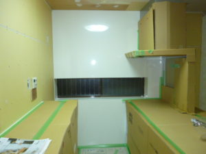 正面部分の収納になりますので、コンセント・電気配線、給湯機リモコンなど配線をしています。上部は換気扇の部材です。キッチンの取り付け準備がほぼ出来上がってきましたね。
