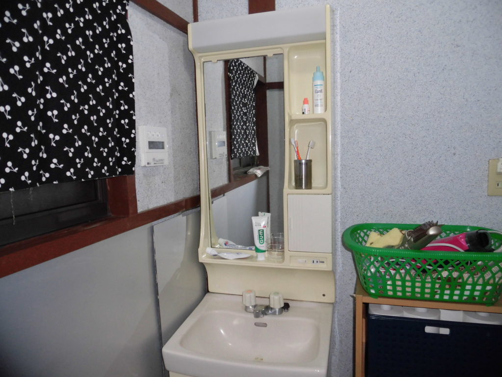 今はお湯とお水の2バルブのカランです。寸法も約50cmくらいで大変コンパクトな洗面台といえます。
