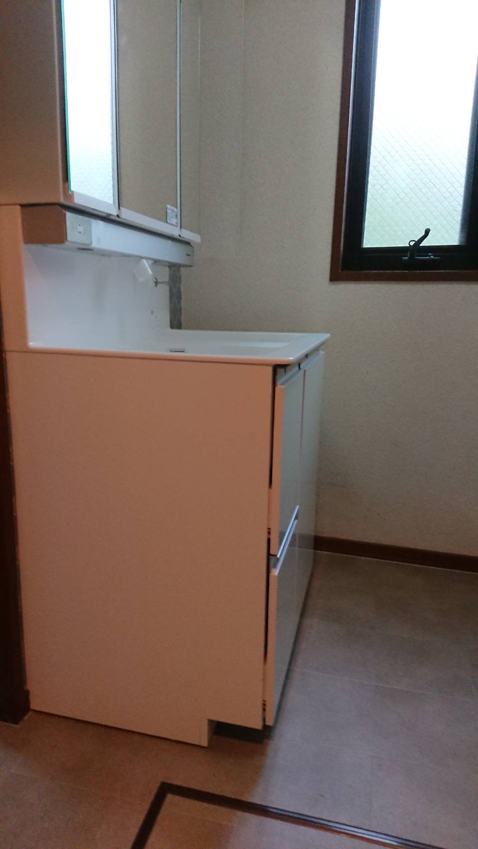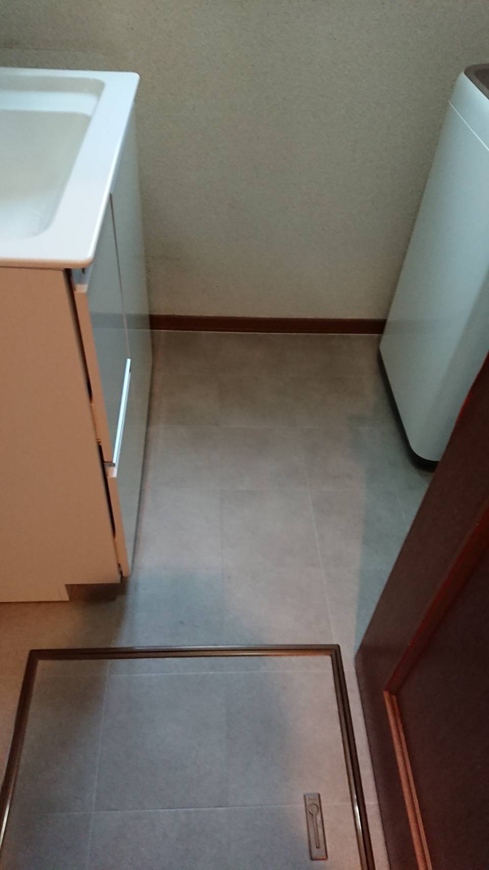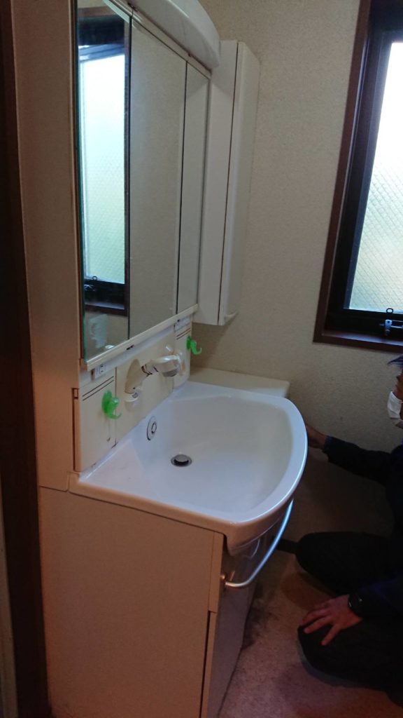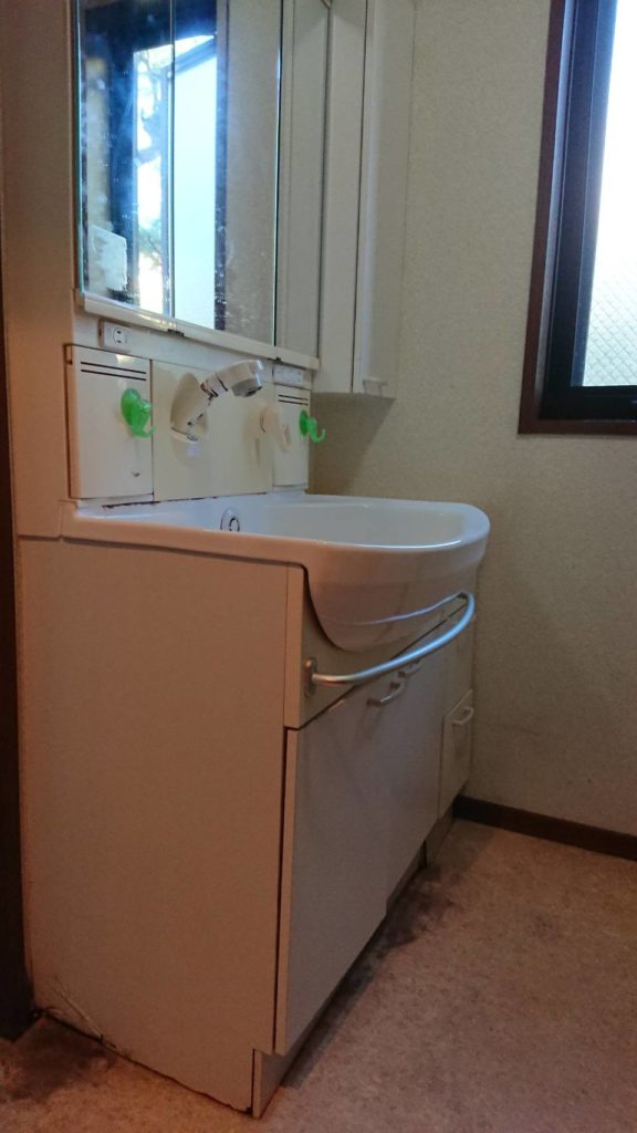 現状の洗面台ですが床がだいぶん水漏れしていたんでいます。取りはずした後、水漏れ部分を補修した後CFークロスを張りかえさせて頂きました。